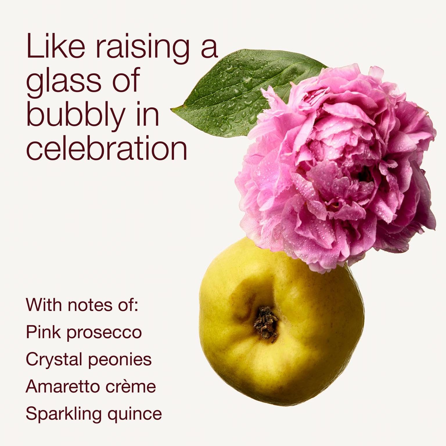 - A JOYFUL, SPARKLING FRAGRANCE MADE TO CELEBRATE: This scented body lotion blends prosecco, sweet amaretto crème, sparkling quince, and delicate peonies into a captivating scent that warms the heart a thousand times over.